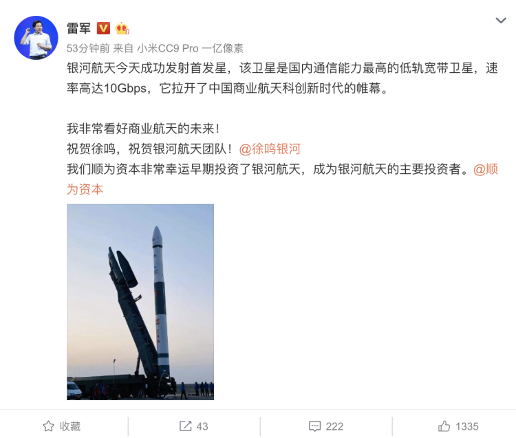 今日,小米集团董事长兼CEO雷军发文称,银河航天今天成功发射首发星,该卫星是国内通信能力最高的低轨宽带卫星,速率高达10Gbps,它拉开了中国商业航天科创新时代的帷幕。雷军说,“我非常看好商业航天的未来”,我们顺为资本非常幸运早期投资了银河航天,成为银河航天的主要投资者。